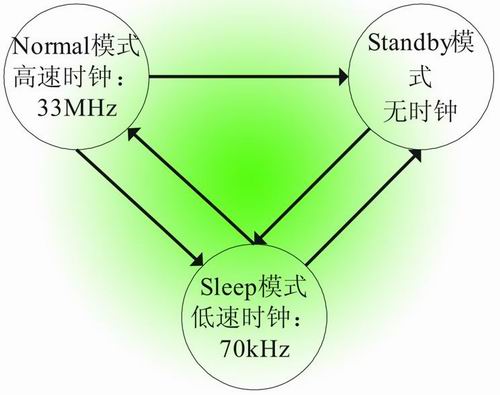 電(dian)子(zi)紙(zhi)顯(xian)示(shi)的(de)顯(xian)著(zhu)特(te)點(dian)之(zhi)一(yi)是(shi)其(qi)省(sheng)電(dian)模(mo)式(shi),當(dang)其(qi)顯(xian)示(shi)一(yi)幅(fu)畫(hua)麵(mian)後(hou),由(you)於(yu)電(dian)子(zi)紙(zhi)的(de)特(te)殊(shu)技(ji)術(shu)因(yin)素(su),此(ci)幅(fu)畫(hua)麵(mian)在(zai)無(wu)供(gong)電(dian)或(huo)不(bu)刷(shua)新(xin)的(de)情(qing)況(kuang)下(xia)可(ke)長(chang)時(shi)間(jian)保(bao)持(chi)。APOLLO芯片驅動部分也同樣具有兩種省電模式:Sleep和Standby,能夠很好的實現低功耗的工作方式。Sleep模式使用低時鍾(70kHz),能夠接收主CPU的指令;Standby模式不使用時鍾,利用主CPU的喚醒信號使APOLLO恢複有效。這兩種模式與Normal模式的轉換如圖5所示。