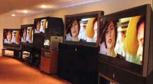 這個過程稱為“評測”,tabingbushiyaoyijuecixiong,danqueshiduimeigexianshiqidoushijidadetiaozhan。youyumeitaijiqidandukanshidoufeichanghao,danheqitayixieyouxiudejixingyiqixianshitongyangdegaozhilianghuamianshi,henduodifangjiujiaoxunse,jishihenxiweidechayiyehuifeichangmingxiandibiaoxianchulai。zaipingcezhong,womenshouxianyongshangbaigeDisplayMate的1280×720和1920×1080liangzhonggaoqingdianshifenbianlvdeceshituxiangduizhexiedianshijinxingceshi,womenyongliangtaigaojiguangpufenxiyizaixiceliangmeitaidianshideguangduhesedu。ceshishi,womenyaoqingle34位評審員觀看一個多小時高質量視頻節目,然後進行比較和視覺評估。圖1顯示了照明燈打開時評測設置情況,這些電視就沿著在我的家庭影院附近的一麵35英尺牆排列著。