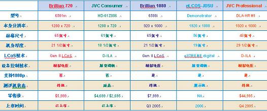 JVC和索尼都不用再作介紹,但另外三家對大多數消費者來說還相當陌生。Brillian是一家小型初創公司,總部在亞利桑那州的Tempe,是美國唯一一家高清電視製造商。他們提供了一台65吋720型樣機(目前已經上市),並努力在評測之前提供多一台1080型。eLCOS也是一家小型初創企業,他們和光引擎製造商JDSUniphase、屏幕製造商DNP以及視頻處理器製造商SiliconOptix合作,提供了一台56吋1080型實驗室演示樣機。請注意該公司提供的機型還不能稱之為樣機,因為它不是為大規模生產而設計的。SpatiaLight也是一個小型初創企業,提供LCoS芯片和驅動電路,曾用在2005年9月LG新推出的71吋1080高清電視中。SpatiaLight同意參加測評但沒能及時提供樣機。
