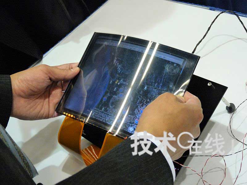 東芝開發出了可通過彎曲顯示器來放大或縮小顯示圖像的柔性液晶麵板,並在全球最大的顯示器國際會議“SID 2010”上進行了發布(論文編號:54.4L)。在AUTHOR INTERVIEWS上,東芝向觀眾演示了通過實際彎曲液晶麵板,來放大或縮小畫麵上顯示的“Google Earth”航攝照片。這種利用柔性顯示器特點的直觀操作,吸引了許多技術人員的關注。