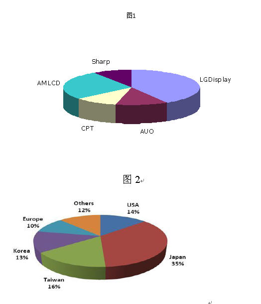 數據顯示,國內所有的LED TV麵板來源全部進口,其中有部分open cell的模式,但是背光模組仍是采用指定購買的方式。從中國大陸地區LED麵板供應來源來看,以2010年第一季度為例,主要供貨來源為LG Display, AMLCD, AUO, CPT(如圖1),其中CPT供貨多數為小尺寸。而從全球LED麵板產值來看,日本廠商目前為市場領導者,台灣和韓國廠商積極擴大產值(如圖2)。由此來看,LED TV麵板產業市場集中度非常高,未來的LED TV市場的競爭格局主要受限於廠商的資源分配情況。