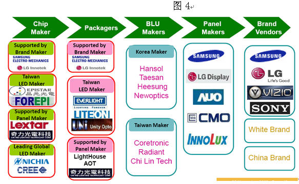 LED,又名發光二極管,作為LCD TV背光源的關鍵零組件,占據了LCD電視麵板總成本的20%,其本身擁有完善而錯綜複雜的供應鏈,並且核心材料屬於長交貨周期產品,LED的穩定供應不免成為麵板和整機廠商頭痛的事情。從LED背光源產業鏈的結構看(圖3),主要有磊晶製程,晶粒製程,晶粒封裝三個階段,分屬產業上中下遊。而擴散片,光學膜和晶粒為三大關鍵組件。由於市場集中度高,在市場需求旺季和需求爆發期,往往出現材料緊缺的狀況。目前擴散片r和晶粒都呈現不同程度的缺貨狀況。