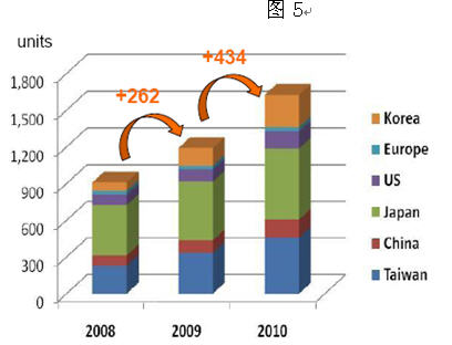 晶粒方麵,預估全球MOCVD數量逐步增加(圖5),其中以韓國和台灣廠商最為積極,Samsung, LG Innotek以及AUO旗下的Lextar都將增加MOCVD機台數量至目前的2~3倍。到2010年底,預計全球高亮度LED晶粒月產能將接近200億,但目前市場應用仍以移動終端產品和汽車照明用為主,前兩者的應用比重高達55%,但TV用背光源應用比重總體仍將難突破20%,因此背光源缺貨狀況的緩解將需要較長時間。