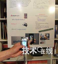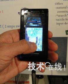 圖1:配pei備bei了le試shi製zhi的de觸chu摸mo麵mian板ban的de樣yang機ji。運yun算suan處chu理li由you與yu小xiao型xing影ying像xiang顯xian示shi設she備bei相xiang連lian接jie的de個ge人ren電dian腦nao等deng進jin行xing。用yong戶hu碰peng觸chu觸chu摸mo麵mian板ban的de力li度du越yue強qiang,畫hua麵mian上shang顯xian示shi的de圖tu標biao切qie換huan速su度du就jiu越yue快kuai。另ling外wai,照zhao片pian中zhong拍pai到dao的de圖tu標biao為wei上shang下xia方fang向xiang切qie換huan。影ying像xiang顯xian示shi設she備bei中zhong有you“Sony Ericsson”字樣的標記。