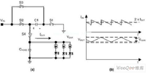 白光LED通常由一個恒定直流電流源驅動,以保持恒定的亮度。在采用單顆鋰離子電池供電的便攜式應用中,白光LED以及電流源上的電壓降之總和可以比電池電壓更高或更低,這意味著白光LED某些時候需要對電池電壓進行升壓。完成這樣應用的最好辦法是使用升壓DC-DC轉換器。這種方法可以大大地優化效率,但代價是成本和PCB麵積增加。另外一種提升電池電壓的方法是使用電荷泵,也稱為開關電容轉換器。本文將詳細地分析這種器件的工作原理。