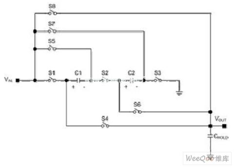 電壓變換在兩個階段內實現。在第一個階段期間,開關S1和S2關閉,開關S3和S4打開,而C1被充到輸入電壓: