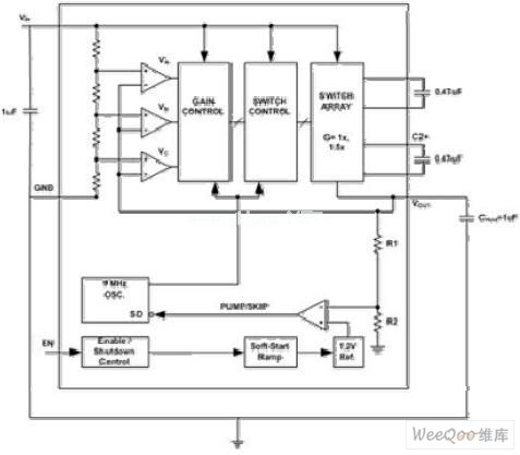 下調的輸出電壓通過PUMP/SKIP比較器與1.2V的電壓基準比較。PUMP/SKIPbijiaoqishuchudianyazaiqidongshixianxingshangsheng,tigongruanqidonggongneng。dangshuchudianyachaoguoqiwangdejixian,qijianbuhuikaiqi,xiaohaodedianyuandianliujianghenxiao。zaizhezhongkongxianzhuangtaideqijian,shuchudianrongCHOLD提ti供gong輸shu出chu負fu載zai電dian流liu。隨sui著zhe這zhe個ge電dian容rong不bu斷duan放fang電dian以yi及ji輸shu出chu電dian壓ya降jiang低di到dao期qi望wang的de輸shu出chu電dian壓ya以yi下xia,電dian荷he泵beng被bei激ji活huo直zhi到dao輸shu出chu電dian壓ya再zai次ci達da到dao高gao於yu這zhe個ge值zhi。
