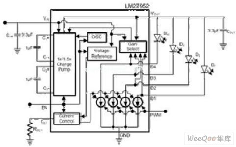 圖5:這個開關電容器白光LED驅動器可用於四個LED