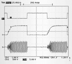 圖6顯示了基於壓電變壓器電路的脈衝調光波形。一個外部驅動信號(曲線4)用來給定工作周期和脈衝串的頻率,在本例中,在50%的工作周期脈衝串的頻率為100Hz。曲線1是反饋網絡的COMP引腳的信號,用來設定工作頻率。熒光燈電壓如曲線3suoshi。zhexietupianshishiyongshuzishiboqidedao,suoyicunzaihundiexianxiang。yingguangdengdejifadianyajihujiancebudao,yinweidengyijingshiredebingcongqianmiandemaichongchuanzhouqiyunxingguolai。