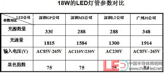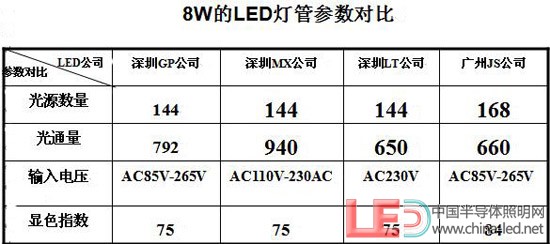 通過上麵的表格可以看出,以上我們任意選擇的四家公司的LED燈管的相關結果數據有的參數會有會有一定的差別,選用LED光源的數量從144-168顆,光通量也從650-940LM,相差的範圍有290LM之多,輸入的電壓有寬電壓,也有窄電壓。顯色指數基本在Ra=75左右,國家LED燈具標準出台後會有一個標準和規範。以上為各廠家自行測試結果(如上圖所示)