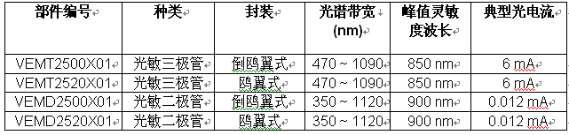 光敏二極管的光電流為12µA,光譜感光範圍為350nm~1120nm,光敏三極管的光電流為6mA,光譜感光範圍470nm~1090nm。VEMD25x0X01和VEMT25x0X01器件的暗電流為1nA,半感光角為±15°,溫度範圍為-40℃~+100℃,可搭配高亮度、高速VSMB20x0X01中的紅外發射器。