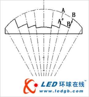進一步分析知道,由於LED光源是在光軸部分的發光強度大,邊緣部分小,而分厚度法得到的鋸齒恰恰是在中間部分比在邊緣部分有更大的齒距(見圖3),因此在光強度大的地方損失會少,即總體上可以有更少的光損失。