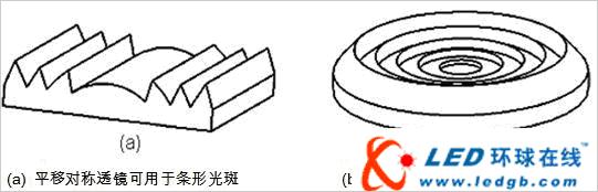 將設計好的截麵旋轉或拉伸,就可以得到三維的透鏡。圖5為兩個菲涅爾透鏡的實例。拉伸得到的(a)可用於條形光斑,旋轉得到的(b)可用於圓形光斑。