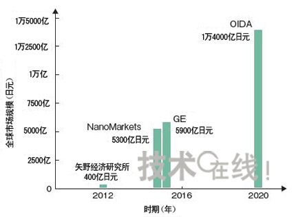 圖有機EL照明/光源市場到2020年將占到照明市場整體的2成圖為針對包括普通照明、特殊照明及背照燈等在內的有機EL照明今後的市場規模,日本矢野經濟研究所、NanoMarkets、GE及OIDA發布的預測及目標。市場規模方麵,預計2015年全球將達到5000多億日元,到2020年將大大超過1萬億日元。