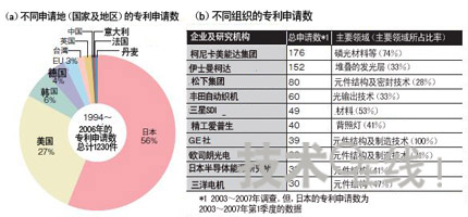 圖日本廠商在開發方麵領先圖為Cintelliq公司就以實現有機EL照明為目的的專利申請數所做調查的結果。按申請地劃分,日本為56%,大大超出排在第2位的美國,遙遙領先(a)。在本圖中,1994~2006年的專利申請數通過2003年以後的文獻調查得到。按不同組織劃分,柯尼卡美能達集團為176件,排在第1位(b)。大約3/4的專利與藍色磷光材料有關。(b)為2003~2007年有機EL照明(包括背照燈)專利按組織劃分的申請數(前10家公司)及主要領域。由於按組織劃分的日本專利申請數數據中不包含2007年第2季度以後的數據,因此,實際上日本企業的申請數有可能更多。