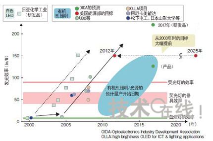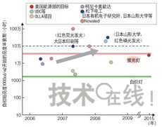 政府機構的資助額大多為3年內數億~30億日元的規模,德國“OPAL(OrganicPhosphorescentlightsforApplicationsintheLightingmarket)”項目為5年內1億歐元(約合140億日元),遠遠多於其他項目。在發光效率方麵迅速追趕白色LED有機EL照明雖然具有一些獨特的特點,但考慮到實際影後,還是避免不了在發光效率、使用壽命、成本等基本性能上與白色LED及現有照明技術一決高低。近來有機EL照明的性能得到了大幅提高。首先是發光效率。目前,有機EL照明在研發水平上比白色LED約落後約2年。2008年6月美國UniversalDisplay(UDC)發布的“102lm/W”的發光效率,與2006年3月日本日亞化學工業發布的白色LED的發光效率不相上下。山形大學的城戶表示,“已經看到了實現200lm/W的曙光”)。