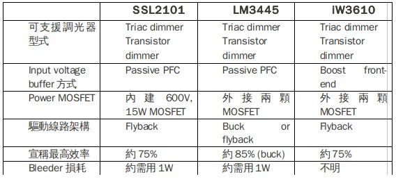 表二、市麵上可見的TriacDimmableLEDLightingDriverIC