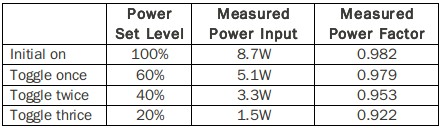 EZdimming偵測wallswitch切換次數,來改變調光準位。自全亮開始,循序降到六分亮,四分亮,二分亮。並且在任何調光階段,都維持高於0.90的功因、高於80%的效率。切換柔和,完全沒有突波電流或噪音的現象。線路精簡,幾乎是零增加硬體成本。