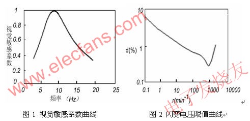 可以被人眼感知的光源閃爍,可以通過統計的方法來測得人眼的對光源閃爍的感覺特性。圖1是人眼對不同頻率的電壓波動引起的視覺敏感係數曲線。從曲線上可以看出最敏感的頻率是8.8Hz,偏離該頻率後,敏感度隨頻率而降低。當閃爍頻率40Hz以上時,感覺就不靈敏;50Hz以上的閃爍就完全沒有感覺。
