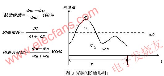 表征光源閃爍強度的參數波動深度、閃爍指數、閃爍百分比,圖3為典型閃爍波形。圖中,Φm為閃爍波峰值,Φn為閃爍波穀值,Φ0為平均光通量,Q1為Φ0以上部分曲線下的麵積,Q2為Φ0以下部分曲線下的麵積,T為周期。