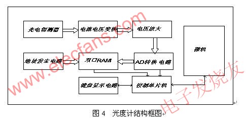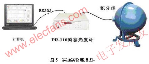 為了精確測量光通量,把光源放在積分球中。經過V(λ)校準的光電探測器接受光信號,其輸出的電信號經過放大轉換電路,將光電探測器輸出的光電流信號轉換成較大的電壓信號,利用AD轉換器進行采樣。由於單片機讀取和存儲數據速度較慢,故而采用了雙口RAM和地址發生電路,使得光度計能夠在采用時自動對數據進行存儲。單片機則在所有采樣過程執行完畢後,再從雙口RAM內讀取數據,並發送給微機顯示處理。係統結構圖和實物連接圖如下。