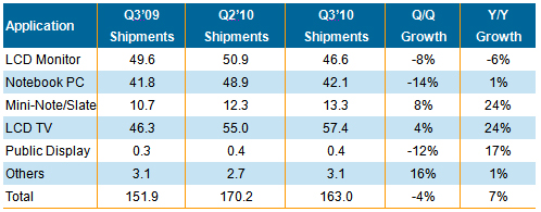 表1. 2010年第三季大尺寸TFT LCD按應用產品分類出貨量與成長率(單位: 百萬片)