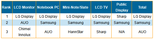以營收來看,Samsung Electronics和LG Display是市場領先者,其市場占有率分別為26.0 % 和25.9%,總銷售金額為美金55億美元。AUO名列第三,營收金額為34億美元,市場占有率為16.1%。Chimei Innolux緊跟在後,市場占有率為14.0% (從2010年第二季的15.7%下滑),營收金額為30億美元。