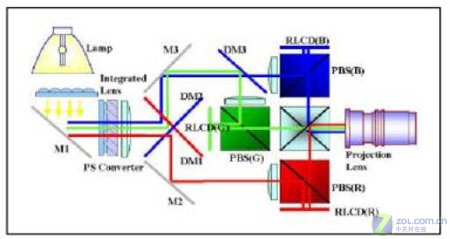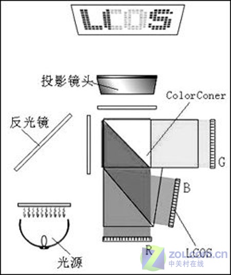 投影機技術基本顯影原理相仿,主要是由鹵素燈、氙氣燈等發光,集光至麵板,將麵板的影像經反射或透射投射出影像,再經過分光、合光係統,最後將影像投射到屏幕顯像。LCOS(LiquidCrystalonSilicon)是一種全新的數碼成像技術,它采用半導體CMOS集成電路芯片作為反射式LCD的基片,CMOS芯片上塗有薄薄的一層液晶矽,控製電路置於顯示裝置的後麵,可以提高透光率,從而實現更大的光輸出和更高的分辨率。