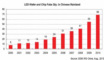 在中國LED產業結構不斷調整和優化的過程中,未來幾年,中國外延、芯片企業規模也將進一步擴大。到2010年8月,中國已有LED外延和芯片企業69家(包括20餘家在建或計劃中)。在已經生產或在建的企業中,有48家涉及LED核心環節外延及芯片製造,有10餘家專注於LED芯片製造。