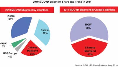 2010年全球MOCVD新增安裝量中,由於受到LED背光在LCD TV滲透的加快帶動下, LCD TV製造強國的韓國增量最多,其次是台灣地區。根據SEMI統計,中國大陸今年MOCVD新增量大概在177台,出貨量居全球第三。另外,根據SEMI統計和分析,結合MOCVD供應情況,2011年中國MOCVD新增量份額有望達到全球的40%,而其它地區的增量會保持與2010年相當的水平或下降。