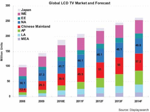 中國既是液晶電視的製造大國,同時也是消費大國,據預計,2011年之後中國將成為全球最大的液晶電視消費市場。此外,中國是世界最大的照明光源,如熒光節能燈、白熾燈等很多照明光源的製造基地和出口基地,2010年中國各類照明光源產量有望達到150億隻以上。隨著LED在該類市場的滲透率不斷攀升,中國LED市場需求潛力驚人。