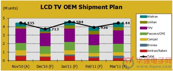 DisplaySearch顯示和電視研究總監Debroah Yang表示,“許多地區市場環境不穩定,從而導致電視需求量也不確定。盡管如此,第一季度的產品發布所預估的需求前景使一些品牌商增加了1月份的生產投入。”雖然電視品牌商對市場前景持謹慎態度,液晶電視代工廠商(OEM/ODM)卻在2010年12月份到2011年3月份期間持續增加每月出貨計劃。這個現象表明電視品牌商正在逐步增加生產外包到OEM/ODM廠商。而這主要是基於成本控管和生產規模的考慮。此外有些品牌商為了獲取所需的麵板供應也會增加釋單比率。