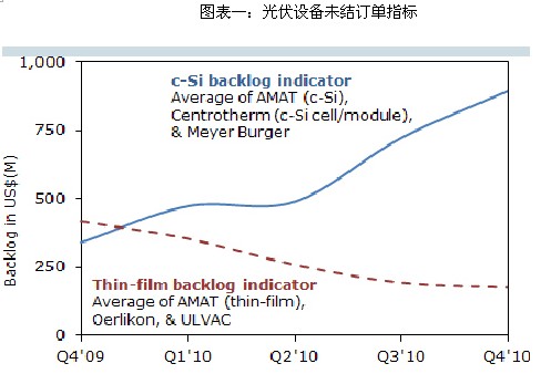 隨著2011年所公布的超越60%年度增長率的產能的擴張,首選設備供應商的訂單使得未結訂單總量創下新記錄,超過了2008年由高價格交鑰匙薄膜生產線業務推動的水平。2010年第四季度末,有20家設備供應商的訂單積累已經超過了1億美金,這些訂單主要的出貨時間集中在2011年上半年。目前的未結訂單總量與2009年第四季度相比有26%的增長,導致2010年的訂單出貨比原高於上一年水平(1.24),其中2010年第二季度的更是創下了1.7的八季高點。