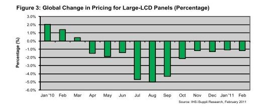 據IHS iSuppli公司的研究,由於需求疲軟和庫存上升,2月份大型液晶顯示器(LCD)麵板價格繼續下降,但到4月份這種情況可能會有所改善,因屆時品牌廠商會增加購買電視麵板。