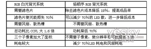 另外,即將在液晶電視中規模化應用的RGBLED背光係統,相對傳統白色LED背光係統省去濾色片後,在大幅提高整體光源利用率的前提下,即使LED的發光最大值略低於CCFL,但CCFL係統可憐的光利用率,致使RGBLED係統總體光利用率仍然比CCFL高,而且LED的本身發光效率還在逐年提高。