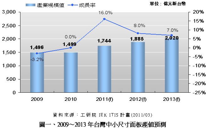 - 2011年台灣中小尺寸麵板產值將大幅成長16%