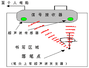 超聲波技術的原理是:利(li)用(yong)超(chao)聲(sheng)波(bo)的(de)傳(chuan)輸(shu)速(su)度(du)較(jiao)慢(man)的(de)特(te)性(xing),根(gen)據(ju)超(chao)聲(sheng)波(bo)發(fa)射(she)到(dao)接(jie)收(shou)時(shi)間(jian)計(ji)算(suan)出(chu)發(fa)射(she)點(dian)到(dao)接(jie)收(shou)點(dian)的(de)距(ju)離(li)。使(shi)用(yong)在(zai)平(ping)麵(mian)定(ding)位(wei)上(shang)的(de)原(yuan)理(li)采(cai)用(yong)的(de)是(shi)在(zai)屏(ping)幕(mu)的(de)一(yi)邊(bian)放(fang)置(zhi)兩(liang)個(ge)按(an)固(gu)定(ding)距(ju)離(li)分(fen)布(bu)的(de)超(chao)聲(sheng)接(jie)收(shou)裝(zhuang)置(zhi),用(yong)於(yu)定(ding)位(wei)的(de)筆(bi)是(shi)一(yi)個(ge)超(chao)聲(sheng)波(bo)發(fa)射(she)器(qi),當(dang)筆(bi)移(yi)動(dong)在(zai)屏(ping)幕(mu)的(de)表(biao)麵(mian)時(shi),所(suo)發(fa)射(she)的(de)超(chao)聲(sheng)波(bo)沿(yan)屏(ping)幕(mu)表(biao)麵(mian)被(bei)接(jie)收(shou)器(qi)檢(jian)測(ce)到(dao),由(you)收(shou)到(dao)超(chao)聲(sheng)波(bo)的(de)時(shi)間(jian)可(ke)以(yi)換(huan)算(suan)出(chu)筆(bi)與(yu)兩(liang)個(ge)接(jie)收(shou)器(qi)的(de)距(ju)離(li)。采(cai)用(yong)三(san)點(dian)定(ding)位(wei)的(de)原(yuan)理(li),即(ji)根(gen)據(ju)三(san)角(jiao)形(xing)已(yi)知(zhi)三(san)個(ge)邊(bian)長(chang)可(ke)以(yi)確(que)定(ding)筆(bi)所(suo)在(zai)的(de)頂(ding)點(dian)原(yuan)理(li),計(ji)算(suan)出(chu)筆(bi)所(suo)在(zai)的(de)位(wei)置(zhi)坐(zuo)標(biao)。是(shi)一(yi)種(zhong)測(ce)距(ju)定(ding)位(wei)模(mo)式(shi)。
