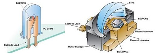 傳統炮彈型封裝,以插件式運用,廣泛運在家電或是通訊產品的指示燈,常看到的顏色多為紅、黃、綠色光等,但因為大部分LED產生的熱隻能藉由2根導線,往組裝的基板上導熱,散熱效果不佳。
