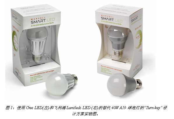 目前Marvell公司提供的超低功耗A19型交鑰匙設計方案和燈泡實物包括兩種(見圖1),均可用於替代40W的A19型球泡白熾燈:一種是采用4顆照明級別Cree XLamp® XP-E高效白光LED的方案;另一種是采用飛利浦Lumileds LUXEON® A LED的方案。此外,Marvell還推出了采用Cree XLamp® MT-G產品的PAR38射燈交鑰匙解決方案,用於替代100W的傳統此類燈具。同時,Marvell還在開發A19 60W等效LED燈泡方案,很快也將與中國客戶見麵。