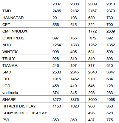 最後,中小顯示屏行業在一年內也經曆了比較大的變動。華映(CPT)和彩晶(HANNSTAR)徹底轉型為中小顯示屏廠家。CPT在2010年出貨量高達3.52億片,比2009年增長135%;HANNSTAR在2010年出貨量高達2.48億片,比2009年增長505%。雖然出貨量大增,但是平均單價不高,毛利低。加上TFT-LCD生產線的高額折舊費用,這兩個廠家還處於虧損的泥潭之中。