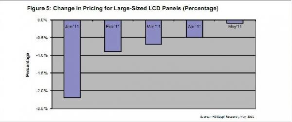 上圖所示為IHS iSuppli公司對1-5月大尺寸LCD麵板價格變動的逐月預測。大尺寸LCD麵板是指對角尺寸從10.1到55英寸以上的麵板。