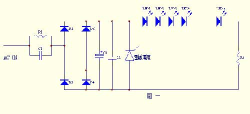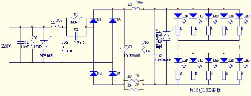 在圖三電路中﹐C1﹑R1﹑壓敏電阻﹑L1﹑R2組成電源初級濾波電路﹐能將輸入瞬間高壓濾除﹐C2﹑R2組成降壓電路﹐C3﹑C4﹑L2﹑及壓敏電阻組成整流後的濾波電路。此電路采用雙重濾波電路﹐能有效地保護LED不被瞬間高壓擊穿損壞。