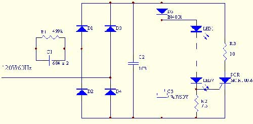 在圖二電路中﹐可控矽SCR及R3組成保護電路﹐當流過LED的電流大於設定值時﹐SCR導通一定的角度﹐從而對電路電流進行分流﹐使LED工作於恒流狀態﹐從而避免LED因瞬間高壓而損壞。
