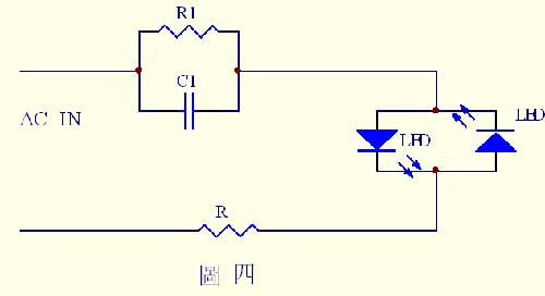 圖四是一個最簡單的電容降壓應用電路﹐電路中利用兩隻反並聯的LED對降壓後的交流電壓進行整流﹐可以廣泛應用於夜光燈﹑按鈕指示燈﹐要求不高的位置指示燈等場合。