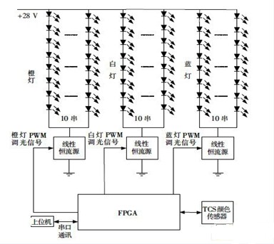 以FPGA作為控製器,根據上位機的調光指令調整PWM 占空比,從而控製背光亮度;采樣顏色傳感器的數據,微調橙燈和藍燈的PWM 占空比,保證在溫度發生變化時色溫不變。
