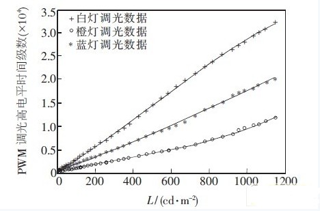 在SS-230平板顯示係統綜合分析儀器上,從低亮度到高亮度變化測量出40個點,調整3種燈的PWM脈衝高電平時間,得到標準白色光源。然後采用線性擬合的方法得到亮度不同情況下3種燈的PWM波形高電平持續時間的比例關係,根據該關係調光可以保證整個亮度範圍內背光源是標準白色光。根據顏色傳感器輸出的紅、綠和藍3顏色通道數據,微調橙燈和藍燈的PWM 高電平時間,維持紅、綠和藍3顏色通道數據的比例關係不變則色溫恒定。采用以上辦法得到出屏白場色溫在(6 500±100)K以內,色坐標u′在0.198±0.01以內,v′在0.468±0.01以內的標準白色光。