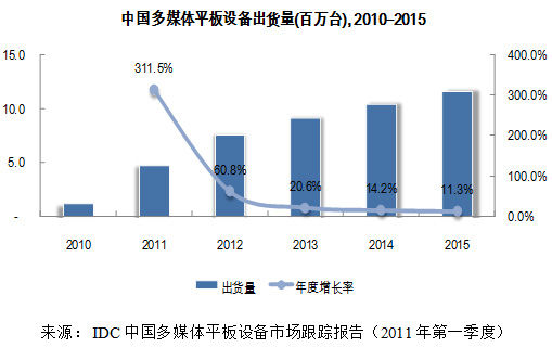 IDC 19日晚間發布的報告稱,2011年第一季度中國多媒體平板設備市場總出貨量達到85.5萬台,和2010年第四季度相比增長僅為5.3%,低於預期水平。