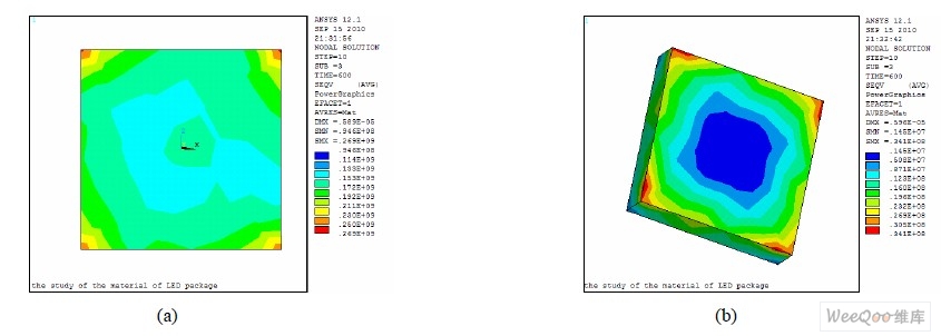 圖4(b)是LED 在穩態時應力分布雲圖。由圖可見,透鏡、外封塑料層和基板頂部的熱應力很小,基板底部應力明顯大於頂部。這是由於基板底部熱膨脹受到X、Y、Z 三個方向的約束所致。圖5(a)為基板底部的應力分布圖,最大在基板底麵的邊角處,為163 MPa;圖5(b)顯示基板頂部最大的熱應力在熱沉與基板交界處,基板頂部邊角處隻有1.43 MPa。