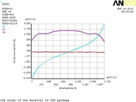 圖4(a)是Lumileds 1 W LED 在最終時刻(600 s)後總位移雲圖,內部帶網格雲圖表示未變形前的結構,另一個實體雲圖表示LED zaishourepengzhanghoudebianxingxiaoguo,zheliduibianxinglianganbilijinxinglefangda。youtukejian,rebianxingzhuyaojizhongzaitoujinghesufengliaochu,tebieshitoujingyusufengliaojiechudifang,zuidabianxingliangdadao6.3 μm。由於基板底部加了X、Y、Z 三個方向約束,相當於基板底部被固定,因此基板底部位移量為0 μm。