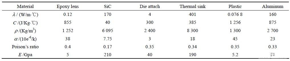 以Lumileds 的1 W 功率型LED 器件(如圖1)為研究對象,該LED 由透鏡、芯片、鍵合層、熱沉、基板及塑封料組成。熱量由芯片經鍵合層傳導到熱沉,最後由基板與空氣進行對流散熱。LED 各種封裝材料熱性能參數如表1 所示。
